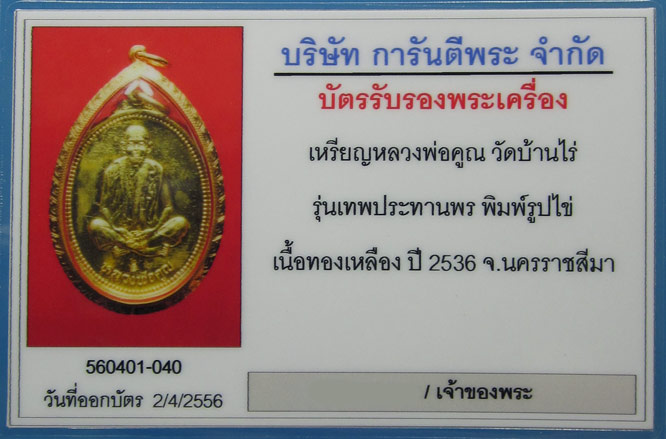 | ชื่อพระเครื่อง | &&..วัดใจ100 เดียว..&&<012>เหรียญรูปไข่เทพประทานพร หลวงพ่อคูณ ปี36 เนื้อทองเหลือง สภาพสวยผิวเงาแว็ปพร้อมเลี่ยมทอง(มีบัตรรับรอง) |