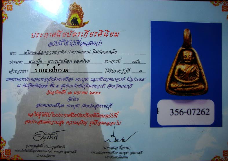 | รายละเอียด | หลวงพ่อเงิน พุทธโชติ แห่งวัดบางคลาน เกิดเมื่อวันศุกร์ เดือน ๑๐ ปีฉลู ซึ่งตรงกับวันที่ ๑๖ กันยายน พ.ศ.๒๓๕๓ และมรณภาพด้วยโรคชรา เมื่อวันศุกร์ เดือน ๑๐ แรม ๑๑ ค่ำ ปีมะแมเวลา ๐๕.๐๐ น. ตรงกับวันที่ ๒๐ กันยายน พ.ศ.๒๔๖๒ รวมอายุได้ ๑๐๙ ปี พรรษา ๙๐ ณ วัดวังตะโก ต.บางคลาน อ.บางคลาน จ.พิจิตร คงทิ้งไว้แต่เรื่องราวอันเป็นปาฏิหาริย์มากมาย นับว่าท่านเป็นพระสงฆ์ที่มีอายุยืนนานมากที่สุดรูปหนึ่ง... ลูกศิษย์ของหลวงพ่อเงิน วัดบางคลาน ที่มีชื่อเสียงโด่งดังต่อมาก็มีหลายท่าน เช่น หลวงพ่อพิธ วัดฆะมัง ที่มีชื่อเสียงในด้านตะกรุดคู่ชีวิต หลวงพ่อน้อย วัดคงคาราม ผู้สร้างตะกรุดหนังปลากระเบน และตะกรุดหนังอีเก้ง ปลัดชุ่ม วัดท้ายน้ำ หลวงพ่อหอม วัดหลวง หลวงพ่อนวล วัดหาดมูลกระบือ หลวงพ่อฟุ้ง วัดปากน้ำ หลวงพ่อขำ วัดโพธิ์เตี้ย หลวงพ่อไป๋ วัดท่าหลวงพล ผู้สร้างเหรียญหล่อหลวงพ่อเพชรจำลอง หลวงปู่ภู วัดท่าฬ่อ เป็นต้น นอกจากนี้ศิษย์ฆราวาสก็คือ เสด็จในกรมหลวงชุมพรเขตรอุดมศักดิ์... มาพร้อมรางวัลที่ 3 งานใหญ่ของสมาคมพระเครื่องพระบูชาจังหวัดสุพรรณบุรี เมื่อวันที่ 16 มกราคม 2554 ณ พันธุ์ทิพย์งามวงศ์วาน...งานพี่ป๋อง สุพรรณ ครับ...ตลับทองอย่างหนาใบนึงครับ***** |