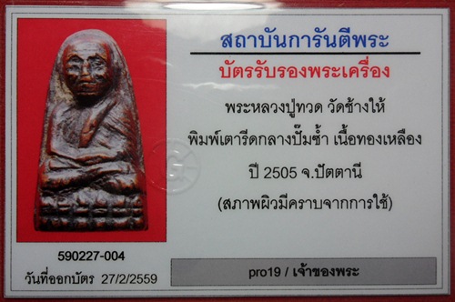 หลวงปู่ทวด พิมพ์กลางปั้มซ้ำ ปี 05 วัดช้างให้ ปัตตานี พร้อมบัตรรับรองครับ