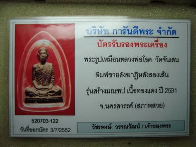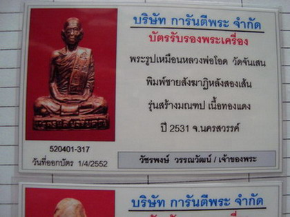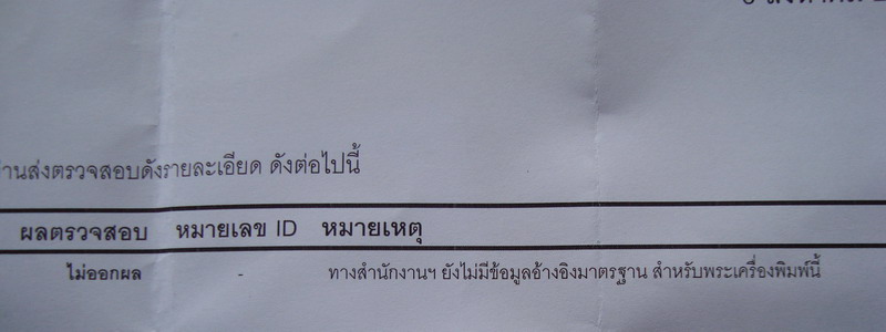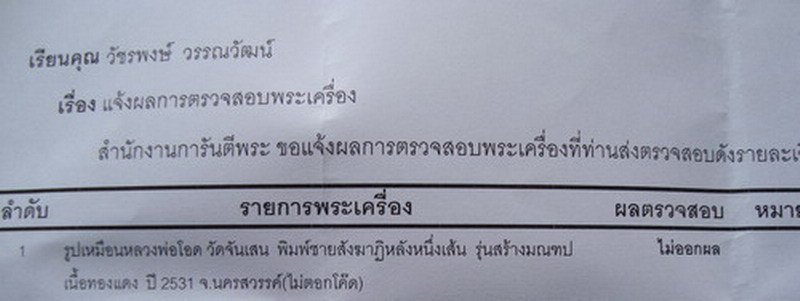 - ส่งตรวจสอบการันตีแล้วครับ ไม่ออกผล พูดกันง่ายๆคือถ้าพระเก๊ การันตี ออกผลเก๊แล้วครับ แต่นี่ไม่ออกผลเพราะพระองค์นี้แท้แต่ไม่มีโค๊ตเท่านั้นครับ จึงออกผลแค่ไม่ออกผล