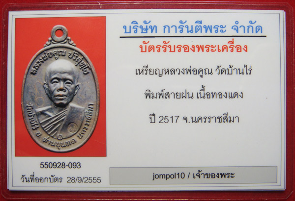 หลวงพ่อคูณ ปี17 บล็อกสายฝน เนื้อทองแดง พร้อมบัตรรับรองพระเครื่อง