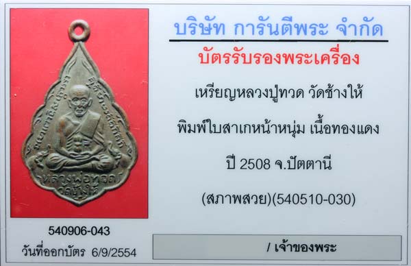 เหรียญหลวงปู่ทวด พิมพ์ใบสาเก หน้าหนุ่ม พร้อมบัตรระบุสภาพสวย ล่าสุดติดที่2 งานพันทิพ 11-09-2554
