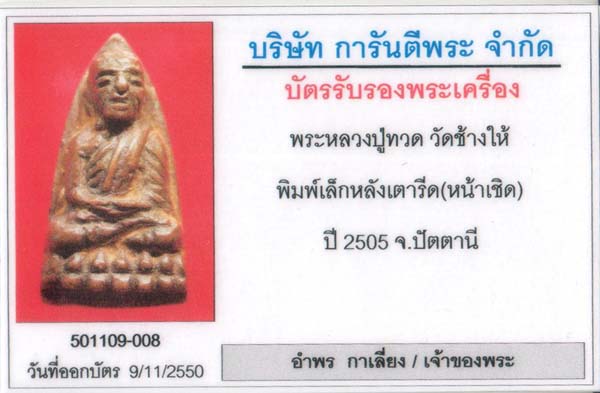 หลวงปู่ทวด หลังเตารีดเล็กหน้าแหงน ปี2505 สภาพสวยเต็มสูตร พิมพ์เต็ม ดินเบ้าเยอะมาก ยาดำแห้งเก่า มาพร้อมบัตรรับรอง