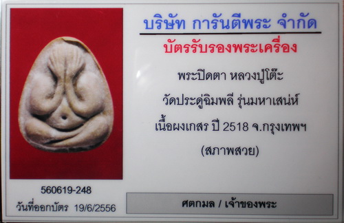 พระปิดตามหาเสน่ห์ เนื้อผงเกสร หลวงปู่โต๊ะ ปี 2518 (เห็นนิ้วมือครบทั้ง 10 นิ้ว / ส่งออกบัตรรับรองให้แล้ว) พระปิดตามหาเสน่ห์สร้างขึ้นเมื่อปี 2518 ด้วยเนื้อผงใบลาน และ เนื้อผงเกสร หลวงปู่ได้เมตตาปลุกเสกนานถึง 1 พรรษาเต็มๆ โดยเน้นพุทธคุณทางด้านเมตตาเป็นพิเศษ จนปรากฎว่ามีผู้นำไปใช้แล้วเกิดประสบการณ์มากมาย สมดังชื่อ "มหาเสน่ห์" นับเป็นพระปิดตารุ่นแรกที่สร้างในนามของวัดประดู่ฉิมพลี...........องค์ที่นำลงในชมรมเป็นเนื้อผงเกสร พระสวย พระผิวตึง ส่วนใหญ่ที่พบพระพิมพ์นี้เนื้อจะปริแยกแตกรานมากๆ เห็นนิ้วมือชัดเจนครบทั้ง10 นิ้ว (ส่วนมากที่พบพระพิมพ์นี้ นิ้วหัวแม่มือจะกดพิมพ์ติดไม่ชัด ) พระดูง่าย พระหนา 6 มิลฯ***รับประกันพระสภาพเดิม ผิวเดิม100% ตามองค์พระแม้กระทั้งขอบข้างก็ยังมีนวลแป้งโรยพิมพ์เดิมๆ ผิวไม่ช้ำจากการสัมผัส ไม่มีอุดซ่อม หรือไล้แต่งผิว