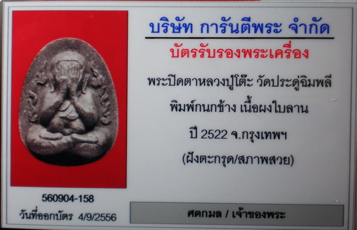 พระปิดตากนกข้างตะกรุดคู่ หลวงปู่โต๊ะ ปี 2522 ในระหว่างปลุกเสกอยู่ ได้เกิดไฟไหมขึ้นที่โต๊ะหมู่บูชา เนื่องจากทางวัดหล่อเทียนใช้เอง ใช้สายสิญจน์เป็นไส้เทียน ซึ่งไม่ค่อยดีนัก เวลาจุดไฟ ไส้เทียนล้มลงมา ไฟจึงลุกไหม้ขึ้น เมื่อไฟลามมาถึงพระปิดตาฯ ที่หลวงปู่ปลุกเสกไว้แล้วนั้น ปรากฎว่าไฟได้มอดดับลงอย่างปาฏิหาริย์ สร้างความมหัศจรรย์ใจแก่ผู้พบเห็นเป็นอย่างมาก กล่าวขวัญถึงความศักดิ์สิทธิ์ไปกันต่างๆนาๆ ผู้นำไปใช้ต่างมีประสบการณ์ด้านแคล้วคลาด และเมตตามหานิยมเป็นที่ยอมรับ ( ข้อมูลจากหนังสือคุณประสิทธิ์ ปริชาน ) มีทั้งบรรจุตะกรุดเงินคู่ และไม่บรรจุตะกรุด สร้างรวมกันประมาณ 10,000 องค์ ( บรรจุตะกรุดเงินคู่สร้างประมาณ 4,000 องค์ ถือว่าสร้างน้อยกว่าพระปิดตาในรุ่นอื่นๆ อีกหลายพิมพ์ที่สร้างจำนวนหลายหมื่นองค์)..................... องค์ที่นำลงในชมรมเป็นเนื้อผงใบลาน สีสวยได้พระเนื้อเข้ม สภาพสวย บรรจุตะกรุดเงินคู่ (ตะกรุดวางอยู่ในตำแหน่งที่สวย ไม่เป็นสนิมเขียว) พระผิวเดิม มีเส้นเกศาเหนือตะกรุด นิ้วมือชัดเจนมากครบทั้ง 10 นิ้ว กนกข้าง ตัวหนังสือ ยันต์หลังคมชัดมาก กำไลข้อเท้าครบทั้ง 12 เส้น มีเส้นสายฝนตามพื้นผิวเหนือศรีษะพระ ...องค์พระหนาครึ่งซม.ในจุดที่หนาที่สุด ***รับประกันพระผิวสวยจริง ผิวไม่ช้ำจากการสัมผัส ไม่มีอุดซ่อม