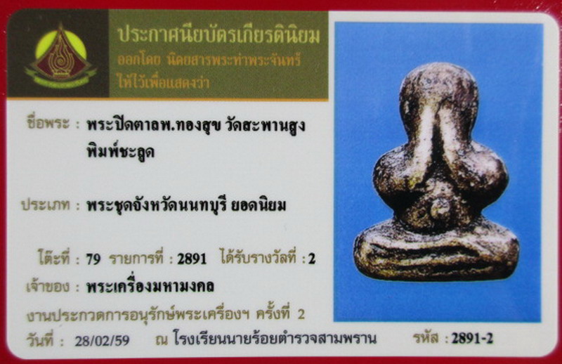 หลวงพ่อทองสุข วัดสะพานสูง พระปิดตาพิมพ์ชลูดใหญ่มีสะดือ เนื้อผงน้ำมันจุมรัก เนื้อจัดดูง่ายมากๆ ยุคต้น ปี 2495 สภาพสมบูรณ์ ส่งประกวดที่งานโรงเรียนนายร้อยตำรวจสวยสามพราน ติดรางวัลที่2 รับประกันพระแท้ตลอดชีพ ร้านรวยมหามงคล ห้างพันทิพย์งามวงศ์วาน ชั้น3 คุณกบ โทร 0951697919
