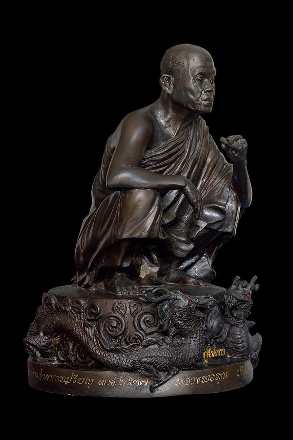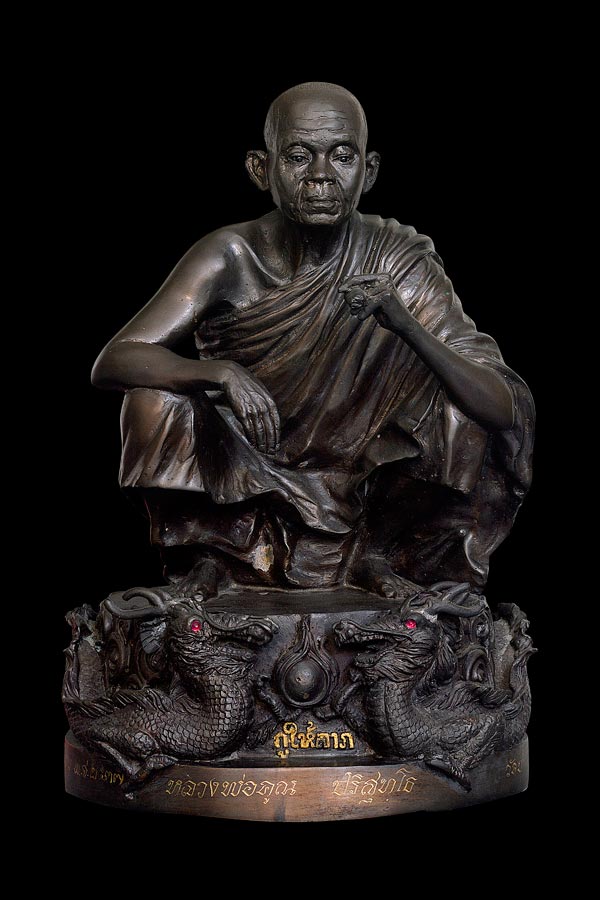 พระบูชารูปเหมือนนั่งยองฐานมังกร ขนาด ๙ นิ้ว หลวงพ่อคูณ ปริสุทฺโธ วัดบ้านไร่ รุ่น กูให้ลาภ เพื่อสนับสนุนการก่อสร้างศาลาการเปรียญและถังเก็บน้ำฝน วัดบ้านบุ อ.จักราช จ.นครราชสีมา พิธีพุทธาภิเษก วันที่ ๒๔ มิถุนายน พ.ศ. ๒๕๓๗ ( วันชาติ ) " ดวงตาหลวงพ่อฝังนิลดำ ตามังกรฝังทับทิมแดง ใต้ฐานฝังเหรียญรูปเหมือนนั่งยอง รุ่นกูให้ลาภ ปั๊มตราวัดบ้านบุ ( จัดสร้าง ๖๗๑ องค์ ) หมายเลข 216
