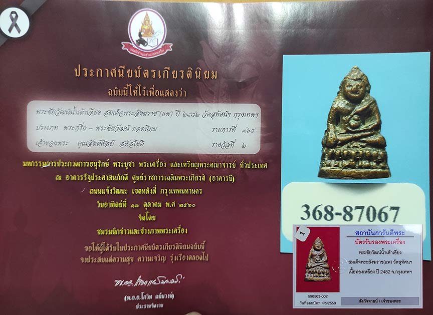พร้อมบัตรการันตีพระแท้ และ บัตรงานประกวดพระเครื่อง ชมรมพระเครื่องพระบูชาไทย รางวัลที่ 2