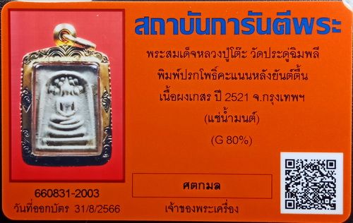 ..พระสมเด็จปรกโพธิ์ ปี 2521 พิมพ์คะแนนหลังยันต์ตื้นสร้างด้วยเนื้อผงเกสรเพียงอย่างเดียว( ขนาดองค์พระสูงประมาณ 2 ซม. กว้าง 1.4 ซม.) เอาไว้บูชาพึ่งพุทธคุณคุ้มครองให้ความร่มเย็นแก่ชีวิต ............องค์ที่ลงในชมรม พระสวย****องค์นี้แช่น้ำมนต์คราบน้ำมนต์คล้ายพระปิดตาปลดหนี้เนื้อผงเกสร พระผิวเดิม องค์พระกดพิมพ์คมชัด พระกรรณ(ใบหู)ชัดทั้ง2ข้าง เห็นใบโพธิ์ชัด ซุ้มองค์พระเรียบร้อยดี ส่วนใหญ่ที่พบตัวหนังสือยันต์หลังจะกดพิมพ์ไม่ชัด แต่องค์ที่นำลงประมูลจัดว่าติดชัด เลี่ยมทองพร้อมแขวนบูชา เป็นพระที่เข้าพิธีเดียวกันกับพระปิดตาปลดหนี้ ,จัมโบ้ 2 อีกทั้งใช้เนื้อเดียวกันกับพระปิดตาที่มีราคาแพงดังกล่าวมากดพิมพ์สร้างเช่นเดียวกัน พุทธคุณจึงไม่แตกต่างกัน
