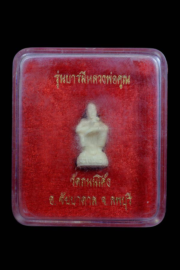 รูปเหมือนนั่งยองแกะ ( ง.แท้ สูง 2.5 ซม. - กว้าง 1 ซม. ) หลวงพ่อคูณ ปริสุทฺโธ วัดบ้านไร่ รุ่น บารมีหลวงพ่อคูณ พ.ศ.2536 ( กล่องเดิม ) / จัดสร้าง 999 องค์ / ผู้จัดสร้าง : พระอธิการสมจิตร ( เจ้าอาวาส ) วัดถนนโค้ง อ.ชัยบาดาล จ.ลพบุรี / วัตถุประสงค์ : เนื่องจากกำลังก่อสร้างอุโบสถวัดถนนโค้ง แล้วเสร็จไปประมาณ 30 % ยังขาดทุนทรัพย์ในการก่อสร้างอีกมาก / พิธีพุทธาภิเษก : ณ วัดบ้านแปรง อ.ด่านขุนทด จ.นครราชสีมา หลวงพ่อคูณ ประธานจุดเทียนชัย พร้อมปลุกเสก รวมทั้งเกจิคณาจารย์อีกหลายรูปร่วมนั่งปรก เมื่อวันที่ 19 ตุลาคม พ.ศ.2536