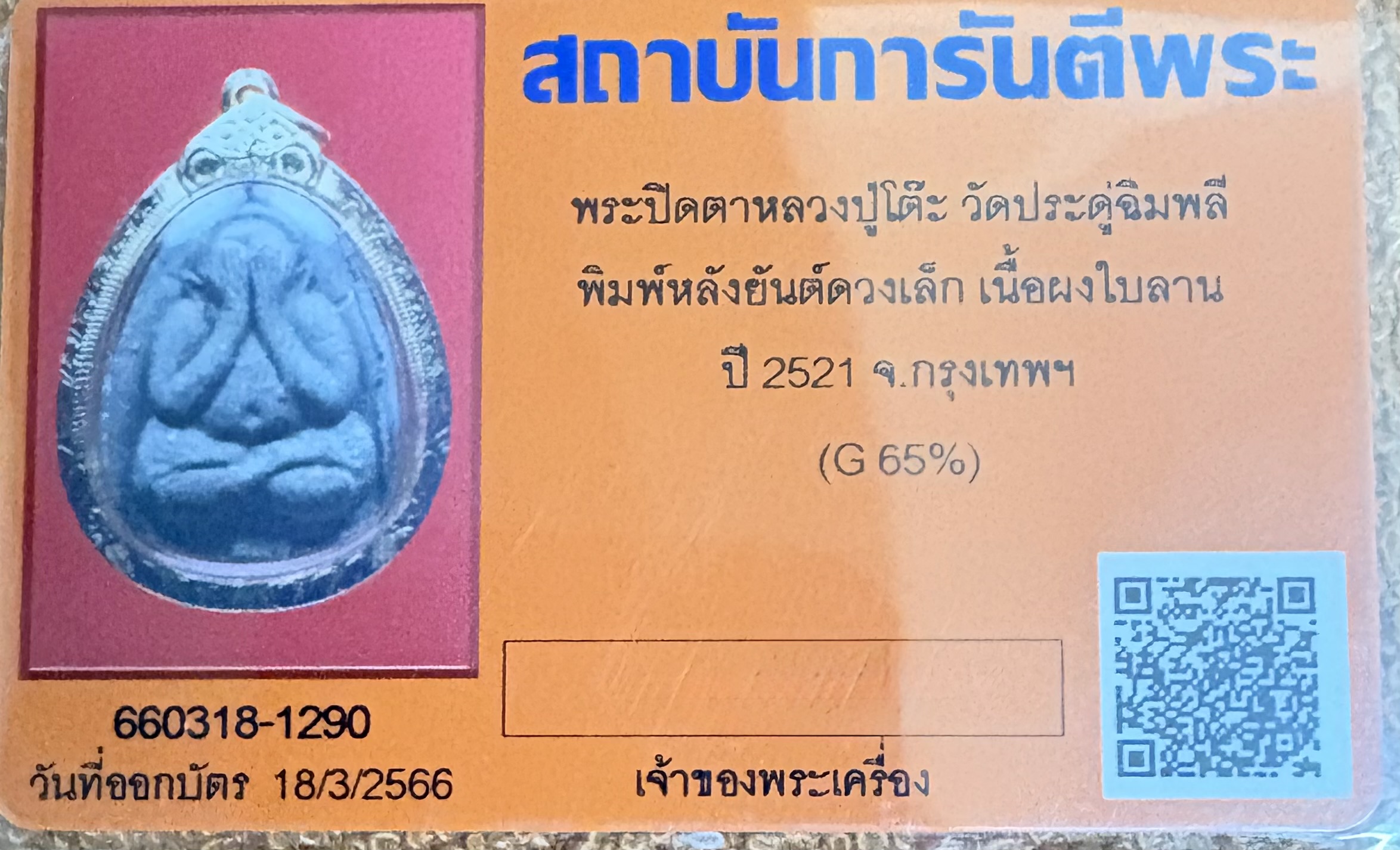 หลวงปู่โต๊ะ พระปิดตายันต์ดวงเล็ก ลป.โต๊ะ เนื้อใบลาน ผิวสวยตึง คมชัดหน้าหลัง พร้อมกรอบทอง 70 นิ้วมือ นิ้วเท้าติด