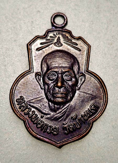 เหรียญหลวงพ่อกวย ปี 2515 รุ่น ยกช่อฟ้า วัดเดิมบาง เนื้อทองแดงรมดำ ไหล่จุด หูขีด สวยๆๆ