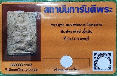 หลวงพ่อผาด วัดดงตาล พิมพ์ทรงสิงห์ เนื้อดิน ปี2474 จ.ลพบุรี ครับพร้อมบัตรการันตีพระ รับประกันตามกฏครับ