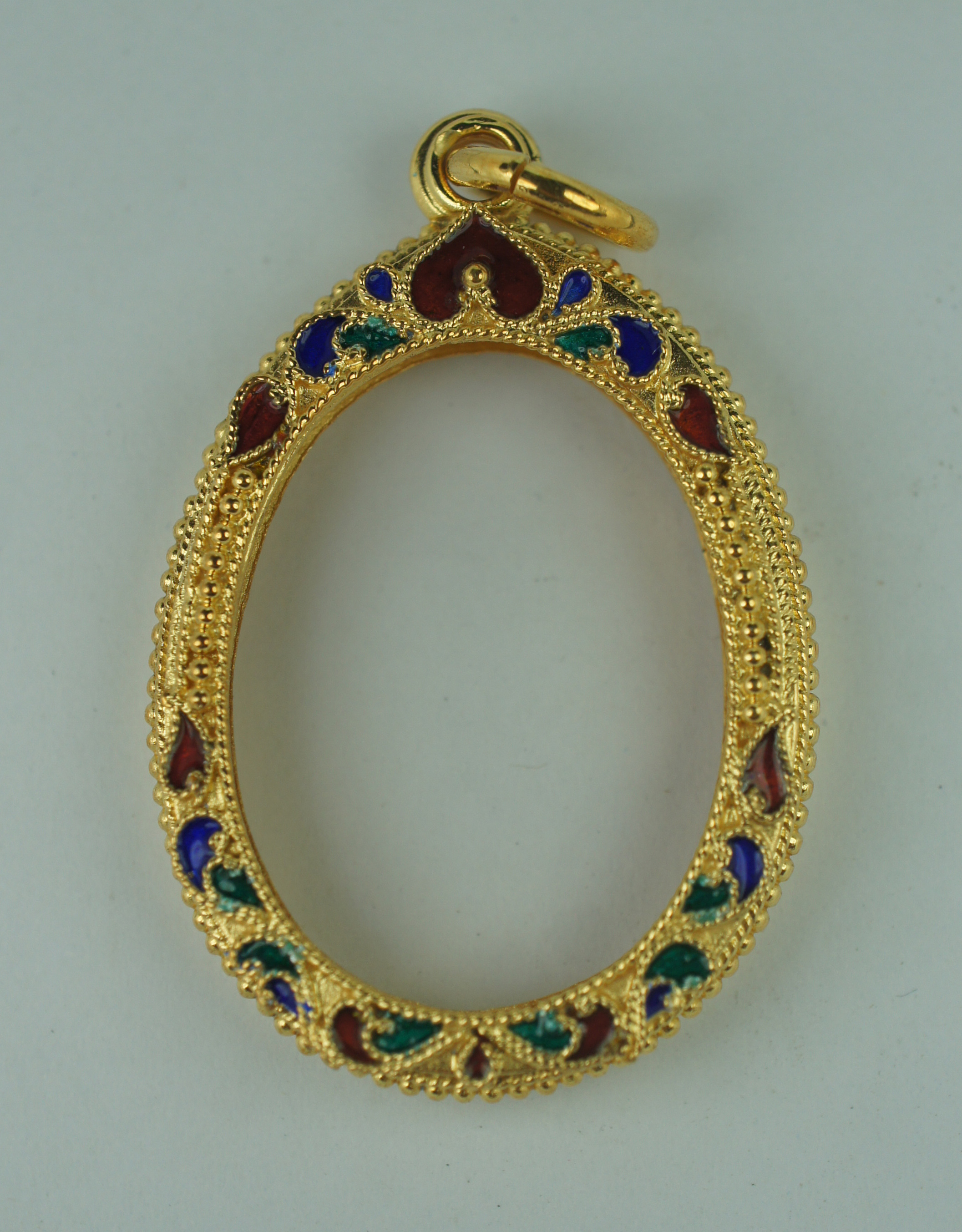งานกรอบเงินแท้ สุโขทัย ( มือหนึ่ง ) ชุบทองแท้ รูปไข่ ลงยา เม็ดไข่ปลา ( งานสวย ) ใส่เหรียญ ผูกพัทธสีมา หลวงปู่ทิม หรือขนาดไกล้เคียง ขนาดความสูง 2.7 ซม. กว้าง 2 ซม. งานขึ้นมือ ( มาตรฐานงานตัวเดียวกับกรอบทองคำแท้ ) น้ำหนัก 6 กรัม การันตรีโดยศรีเมืองระยอง พระเครื่อง