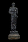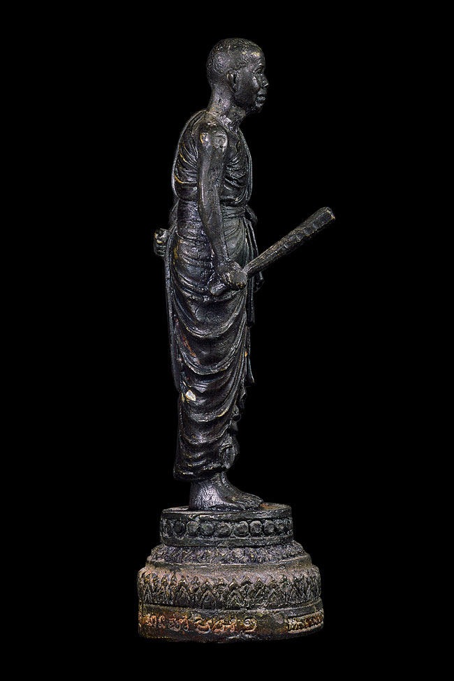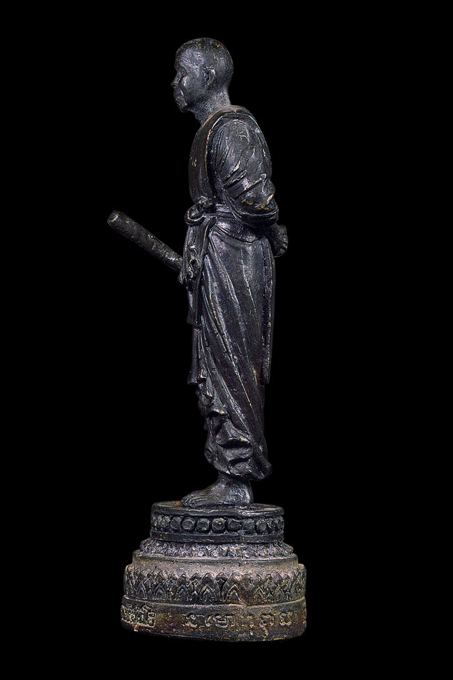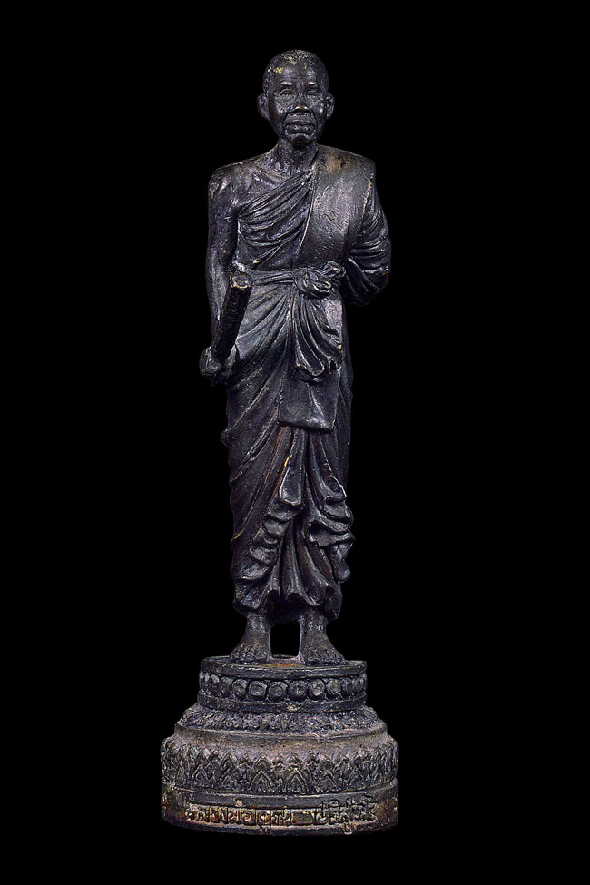 | พระบูชารูปเหมือนยืนถือไม้เคาะศีรษะ หลวงพ่อคูณ ปริสุทฺโธ วัดบ้านไร่ ( พิมพ์ใหญ่ , สูง 5 นิ้ว , ฐาน 1.5 นิ้ว ) รุ่น ดีจริงจริง ( เนื้อโลหะ ) พ.ศ.2555