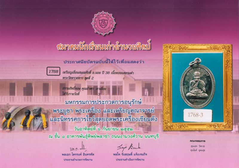 เหรียญหลวงปู่ทวด รุ่นเลื่อนสมณศักดิ์ ปี2538 อ.นอง วัดทรายขาว เนื้อทองแดงรมดำ สภาพสวยมาก รมดำเดิมๆ ผิวปรอทเคลือบรมดำแห้งมากๆ จมูกโด่ง สวยเต็มรูป ผิวมี3 แบบในองค์เดียว 1.ผิวปรอทที่เคลือบอยู่ จะชี้ให้เห็นว่าพระเก็บดี ซึ่งองค์นี้ยังมีอีกมาก 2.ผิวปีกแมลงทับ จะเกิดหลังจาก ผิวปรอททำปฏิกิริยากับสิ่งแวดล้อม เช่น เหงื่อที่มือ ความชื้น แสง ฯลฯ จะทำให้ผิวปรอทกลายสภาพเป็นผิวปีกแมงทับ 3.ผิวรมดำด้าน เมื่อผิวปรอทกลายสภาพเป็นสีปีกแมลงทับ ต่อไปก็จะกลายเป็นรมดำด้าน ดังนั้นผิวพระรมดำเดิมๆ ผิวปรอทจะแห้งออกสีขาว พร้อมใบประกาศ ที่3 งานพันทิพย์ ไม่ได้มาง่ายๆ ถ้าพระไม่สวยจริง เพราะต้องฝ่าพวกบล็อคทองคำ และพวกโค๊ตแปลก เยอะมาก องค์นี้เป็นพิมพ์ไข่ปลาล่าง