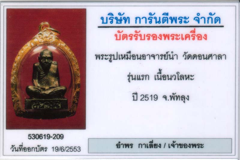 หล่อรูปเหมือนลอยองค์ อาจารย์นำ วัดดอนศาลา ปี2519 เนื้อนวะโลหะก้นอุดเงิน เลี่ยมทอง สร้างโดยพระเจ้าวรวงศ์เธอพระองค์เจ้าภาณุพันธุ์ยุคล อาจารย์นำท่านเป็นพระที่ปฎิบัติธรรมอย่างเคร่งครัด และได้ร่ำเรียนพุทธาคมมาตั้งแต่เยาว์วัย ทำให้มีญาณแก่กล้า พระอาจารย์นำได้มรณะภาพในปี2520 ด้วยอาการสงบ พระบาทสมเด็จพระเจ้าอยู่หัว สมเด็จพระนางเจ้าฯพระบรมราชินีนาถ พร้อมทั้งสมเด็จพระเจ้าลูกยาเธอ ได้เสด็จพระราชดำเนินมาร่วมพิธีพระราชทานเพลิงศพด้วยพระองค์เอง สำหรับพระรูปเหมือนอาจารย์นำองค์นี้เป็นเนื้อนวะ สภาพสวยมาก ผิวเดิมๆเก็บดีมาตั้งแต่แรก เลี่ยมทองพร้อมใช้ และมีบัตรรับรองครับ