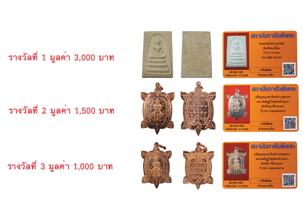 - เพื่อแทนคำขอบคุณนี้ ทางเว็บไซต์ฯ ขอมอบพระเครื่องพร้อมบัตรรับรอง QR Code จำนวน 3 รางวัล ประจำเดือนธันวาคม 2568 นี้ให้กับท่านสมาชิกฯ โดยทางเว็บไซต์ฯจะจับสลากจากรายชื่อท่านสมาชิกนิตยสารการันตีพระออนไลน์และสมาชิกพัฒนาเว็บไซต์ฯทุกท่าน ในวันเสาร์ที่ 6 ธันวาคม 2568 เวลา 16.00 น. และจะประกาศรายชื่อผู้ได้รับรางวัล ที่หน้าเว็บไซต์ฯในวันจันทร์ที่ 8 ธันวาคม 2568 โดยท่านสมาชิกสามารถรับรางวัลได้ที่สถาบันการันตีพระ ชั้น 1 หรือ แจ้งให้จัดส่งทางไปรษณีย์ได้ทางไลน์แอดที่ @g-pra.payment (24 ชั่วโมง) หรือโทรแจ้งที่เบอร์โทร 02-521-0699 , 02-521-0712 ( ค่าจัดส่ง 150 บาท )