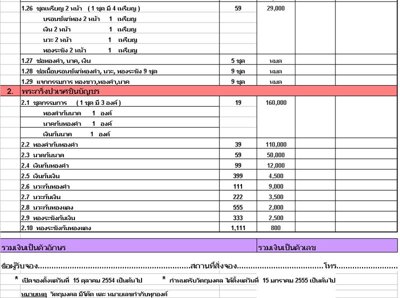 1. เงินก้นทองคำ มีจำนวน 1 องค์ ราคาองค์ละ 12,500 บาท