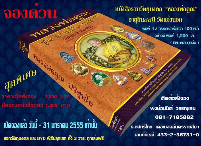 ด่วน ช้าหมดอดแน่ครับ หนังสือเล่มนี้กำหนดแล้วเสร็จพร้อมส่งในวันที่ 17 กุมภาพันธ์ 2555 เนื่องในวันเกิดของหลวงปู่นิยม เจ้าอาวาสวัดแจ้งนอก....โดยจะนำหนังสือทั้งหมดเข้าพิธีให้หลวงพ่อฯปลุกเสกเพื่อความเป็นศิริมงคลแก่ผู้ที่สั่งจองทุกท่าน.........หนังสือเล่มนี้จัดพิมพ์เพียง 1,500 เล่มเท่านั้น ( หนังสือทุกเล่มมีโค๊ตหมายเลขนัมเบอร์ทุกเล่ม ) ........... เปิดให้จองถึงวันที่ 31 มกราคมนี้เท่านั้น.....วันนี้นำมาให้ได้จับจองกันในราคา 1,200 บาท ( บวกเงินค่าจัดส่งทั่วประเทศ 100 บาท / เล่ม ) หลังจากนั้นขายตามราคาปกคือ 1,800 บาท..... ติดต่อสั่งจองโอนเงิน ตามรายละเอียดในโบรชัวร์ครับ..........(จองก่อนโอนเงินก่อนได้สิทธิ์ก่อน)......... ขอบคุณครับ.........