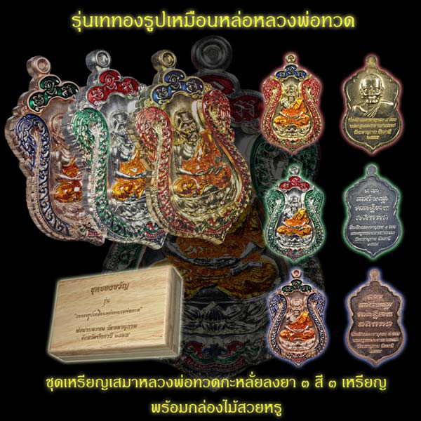 รายการที่ 6. ชุดเหรียญเสมาหลวงพ่อทวด กะหลั่ยลงยา 3 สี 3 เหรียญ ในกล่องไม้สวยหรู จองชุดละ 1,000 บาท ได้มาใหม่ มี 3 ชุดครับ
