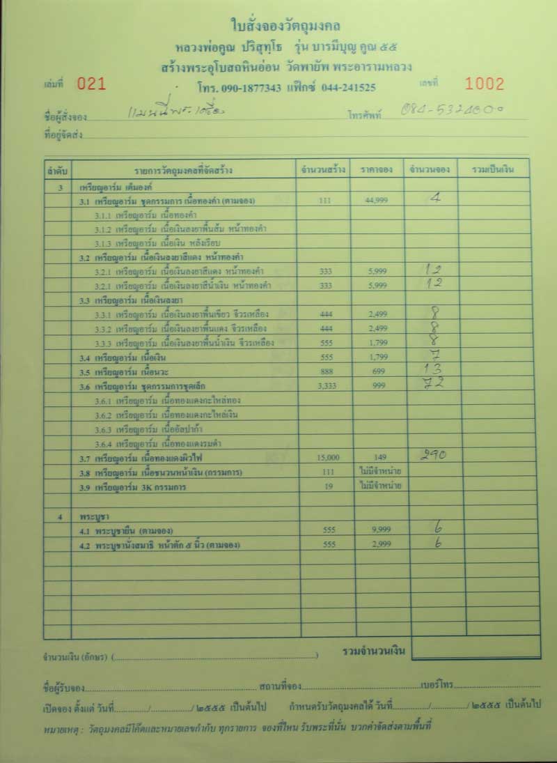 ร้าน ’แมนนี่พระเครื่อง’ เปิดรับจองหลวงพ่อคูณ รุ่น ‘ บารมีบุญ คูณ ๕๕ ’ สร้างอุโบสถหินอ่อน วัดพายัพ พระอารามหลวงมีโค๊ดและหมายเลข กำกับทุกรายการ ทุกรายการราคาวัด รับพระได้วันที่25 กรกฏาคม 25555 รายการตามรูปข้างบนเลยครับ