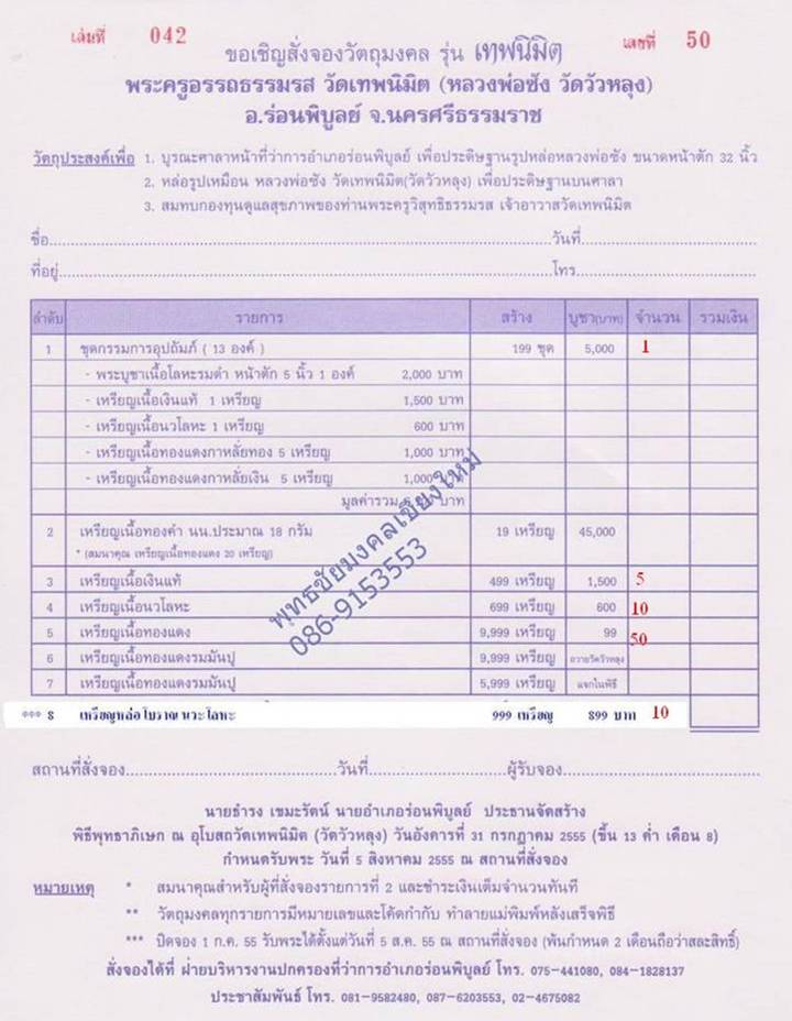 เปิดจองวัตถุมงคล เปิดจองวัตถุมงคล พ่อท่านซัง วัดวัวหลุง รุ่นเทพนิมิต นายธำรง เขมะัรัตน์ นายอำเภอร่อนพิบูลย์ เป็นประธานจัดสร้าง