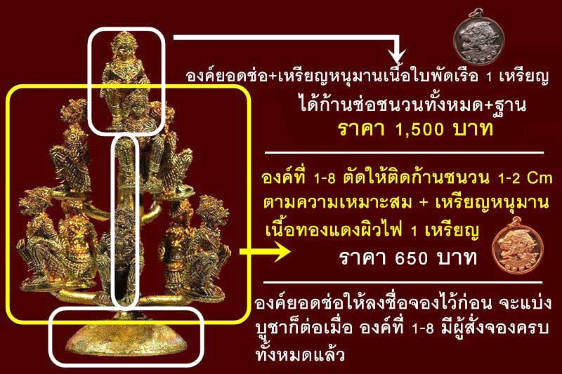 . องค์ยอดช่อ (ตนที่ 9) 1,500 บาท + เหรียญหนุมานเนื้อใบพัดเรือ 1 เหรียญ ฟรีค่าจัดส่ง (องค์ยอดช่อ จะแบ่งให้บูชา เมื่อมีการจอง องค์ที่ 1-8 ครบก่อนครับ คนที่ลงชื่อจองคนแรกจะเป็นผู้ที่ได้ครับ
