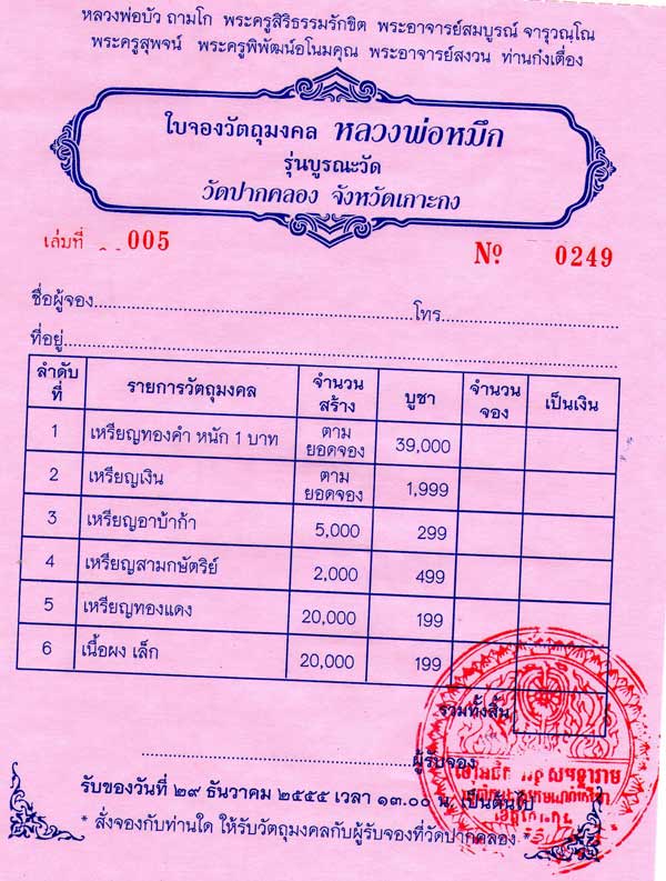โอนเงินไม่เกินวันที่ 10 พฤศจิกายน 2555.....รับพระวันที่ 29 ธันวาคม 2555