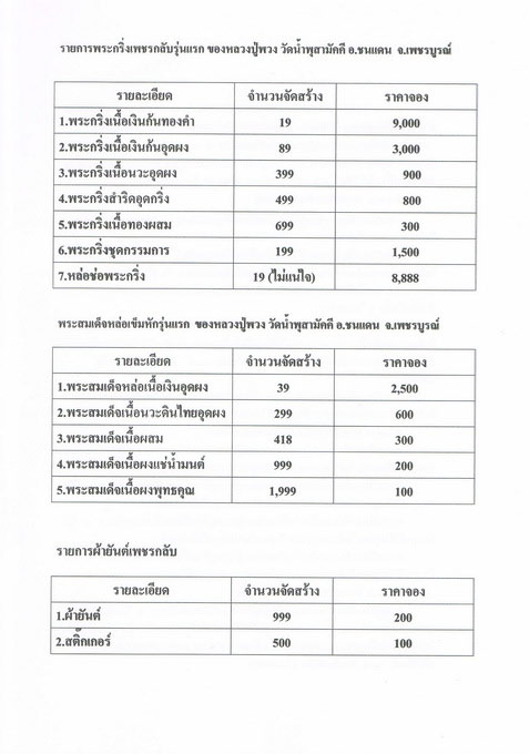 1. พระสมเด็จเนื้อผง ราคาจององค์ละ 100 บาท จำนวน 1 องค์ + ผ้ายันต์เพชรกลับ ราคาจองผืนละ 200 บาท จำนวน 1 ผืน บูชาชุดละ 300 บาท มีจำนวน 10 ชุด