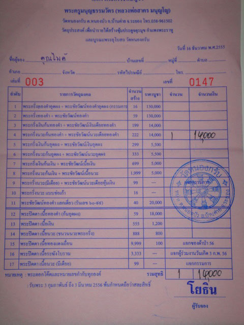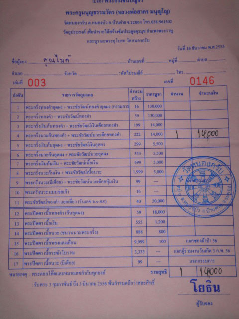 ใบจองวัด พระกริ่งเนื้อนวะก้นทองคำ + พระชัยวัฒน์เนื้อนวะเดือยทองคำ ราคาใบจองละ 16,000 บาท มี 2 ใบ