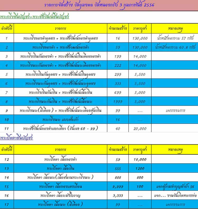 - พระชัยวัฒน์ชินบัญชร เนื้อทองคำ มี 1 องค์ ราคา 24,000 บาท