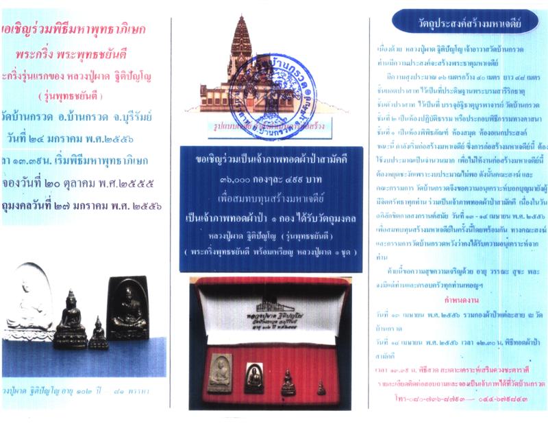 ขอเชิญชวนร่วมทำบุญเป็นเจ้าภาพผ้าป่าสามัคคี2556 หลวงปู่ผาด วัดบ้านกรวด กองละ๔๙๙ รับ ๔รายการ พระกริ่งพุทธชยันตี, พระชัยวัฒน์, เหรียญ โลหะ หลวงปู่ผาด, พระสมเด็จเนื้อผง หลวงปู่ผาด. เพื่อสมทบทุนสร้างมหาเจดีย์ วัดบ้านกรวด บุรีรัมย์ รับพระ หลัง ๒๗ มกราคา ๒๕๕๖ ร่วมกันทำบุญ ครับ ส่งถึงบ้าน ครั้งละ๑๐๐.-พร้อมของสมนาคุณ จองที่หน้าเวปนี้ได้เลย ครับ หรือที่ www.mahalap34.com หรือที่ เมล์ mahalap@hotmail.com หรือ โทร.0818-55-2112