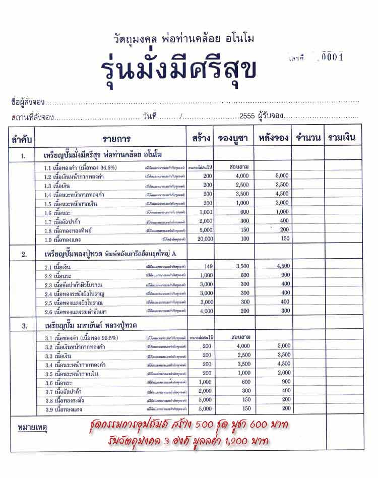 ***ชุดกรรมการอุปถัมภ์ สร้าง 500 ชุด บูชา 600 บาท (รับวัตถุมงคล 3 องค์ มูลค่า 1,200 บาท)*** มียอด 3 ชุด |