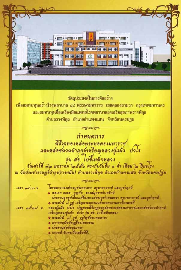 ***วัตถุประสงค์การจัดสร้าง เพื่อสมทบทุน สร้างโรงพยาบาล ๘๔ พรรษามหาราช เขต คลองสามวา กรุงเทพมหานคร