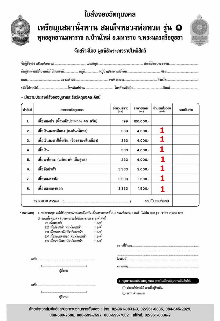 1..ใบจองเหรียญเสมานั่งพาน พุทธอุทยานมหาราช รายการที่ 2-8 ราคา 54000. ยอดจากคุณรุจ สวนหลวง จองจากทีมงานเวบยู (โอนชื่อเป็นของลูกพระพรหมครับ)
