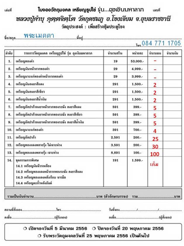 ขอเชิญร่วมบุญสั่จองวัตถุมงคลรุ่น ถุงเงินมหาลาภ หลวงปู่คำบุ วัดกุดชมภู จ.อุบลราชธานี วัตถุประสงค์เพื่อสร้างซุ้มประตูโขงให้แล้วเสร็จและยังถือเป็นวัตถุมงคลรุ่นสุดท้ายที่ใช้ชื่อวัดกุดชมภูในการจัดสร้างวัตถุมงคลของวัด ร่วมด้วยช่วยกันครับ ตามกำลัง ขออนุโมทนาบุญด้วยครับ ยอดสั่งจองดูที่รูปใบจองเลยครับ