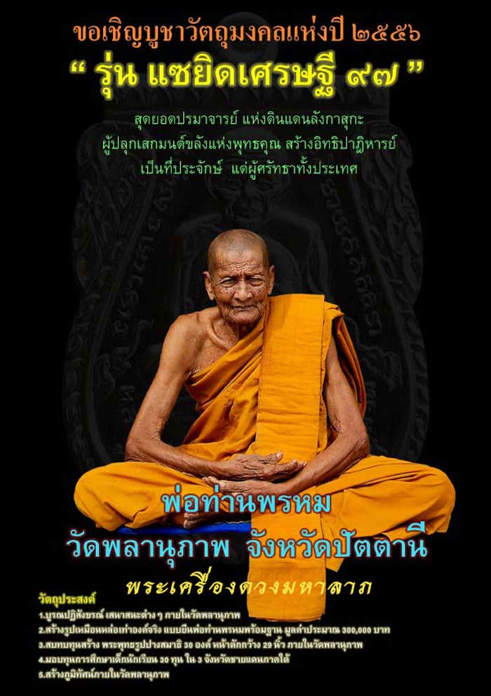 | หัวข้อกระทู้ : ๑๑๑ เชิญสั่งจองวัตถุมงคล พ่อท่านพรหม วัดพลานุภาพ รุ่น.แซยิดเศรษฐี๙๗ ๑๑๑ |