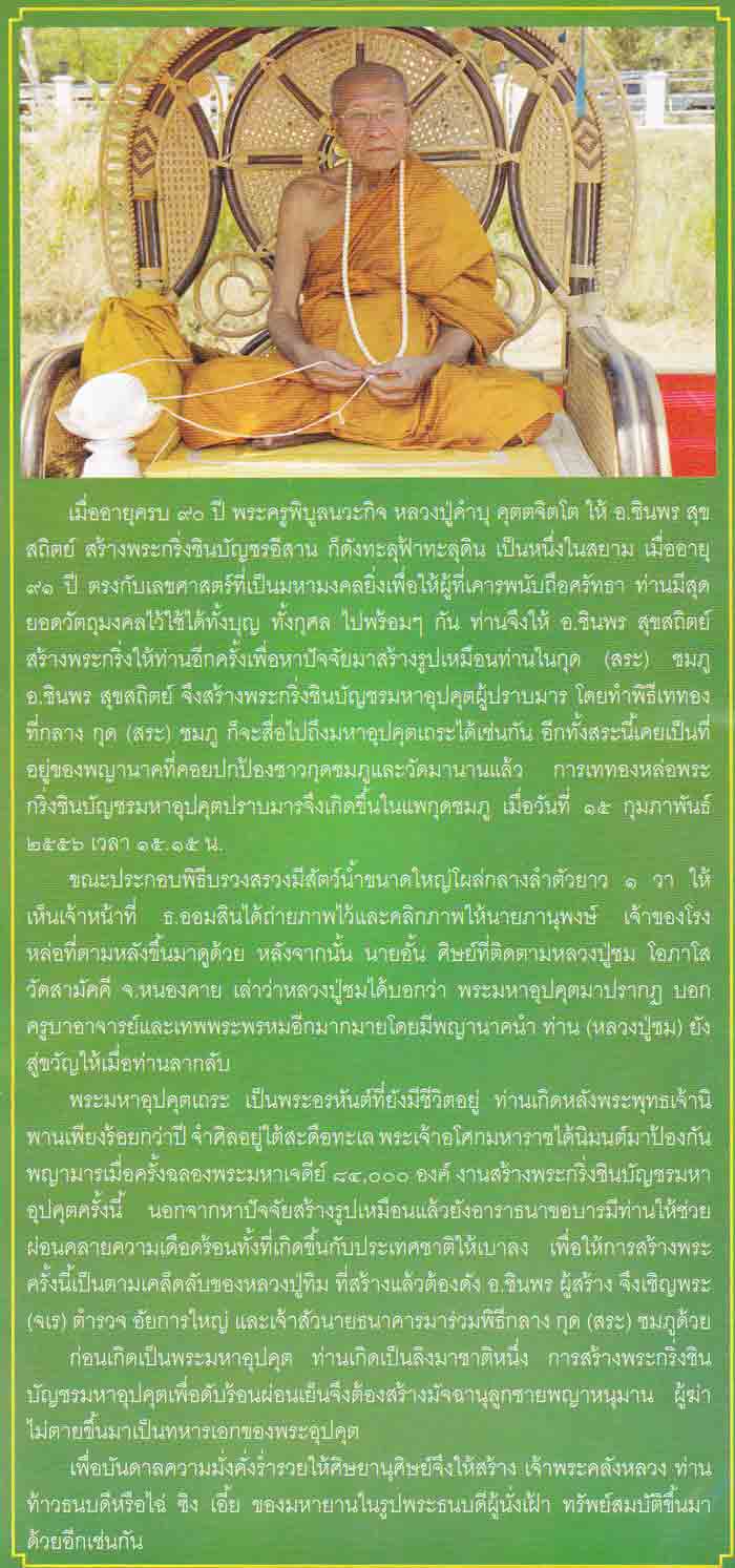 ๑๕ กุมภาพันธ์ ๒๕๕๕ หลวงปู่คำบุ คุตตจิตโต ยอดพระเกจิอาจารย์เมืองดอกบัวงาม อนุญาตให้ อ.ชินพร สุขสถิตย์ ศิษย์เอกหลวงปู่ทิม อิสริโก สร้างพระกริ่งชินบัญชรและเครื่องรางของขลังจากทั้งของสายตะวันออกและสายอีสานก็ประสบผลสำเร็จเป็นที่น่าพอใจ พระกริ่งชินบัญชรอีสานที่เททองกันแบบโบราณ ก็ดังทะลุฟ้าทะลุดิน เป็นหนึ่งในสยาม