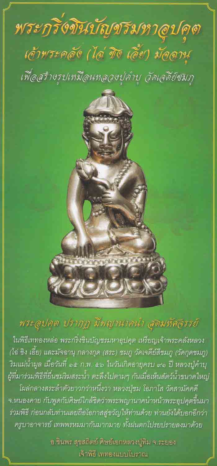 วัตถุมงคลทั้งหมดนี้จะนำรายได้ไปก่อสร้างรูปเหมือนหลวงปู่คำบุ คุตตจิตโต ขนาดกว้าง ๕ เมตรใน กุดชมภู พิธีเททองจะมีขึ้นในวันคล้ายวันเกิดอายุครบรอบ ๙๑ ปี ของหลวงปู่คำบุ ใน วันศุกร์ที่ ๑๕ กุมภาพันธ์ ๒๕๕๖ เวลา ๑๕.๑๕ น. ทำพิธีบรวงสรวงในแพกลวงกุดชมภูเพื่ออันเชิญ พระมหาอุปคุต เถระขึ้นมาจากกลางสะดือทะเล เชื่อแน่ว่าหลวงปู่คำบุ มีบารมีพอจะอาราธนานิมนต์ พระอุปคุตขึ้นมาได้อย่างแน่นอน เพราะท่านละวางหมดกิเลสแล้ว เล็บมือเล็บเท้า ที่ตัดไว้เมื่อ ๓ ปีก่อน กลายเป็นพระธาตุใส่เป็นแก้ว แล้วท่านจะไม่ไปร่วมทำบุญ สร้างกุศลให้ตนเองและครอบครัวกับพระอริยะสงฆ์ในระดับนี้อีกหรือในวันเททอง ยังได้อาราธนานิมนต์พระอริยสงฆ์ ๔ รูป นั่งปรกในแพกลางสระน้ำ คือ