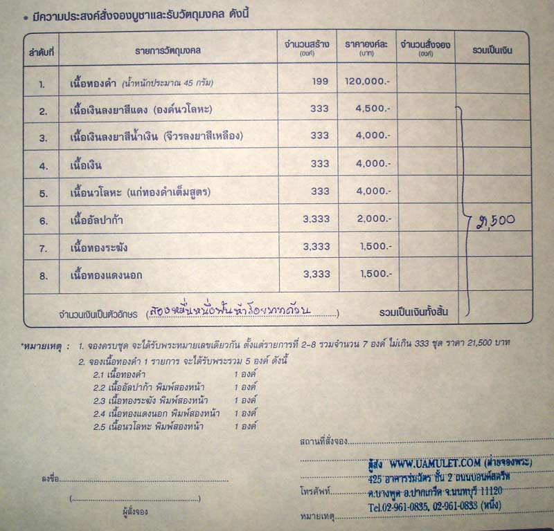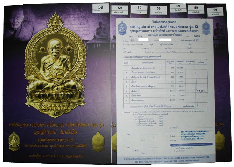 ใบจองเหรียญและใบกำกับพระ เหรียญ เสมานั่งพานหลวงปู่ทวด พุทธอุทยานมหาราช รายการที่2-8 หมายเลข 59