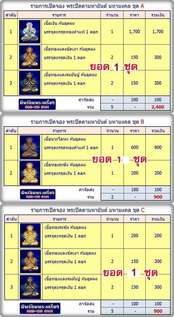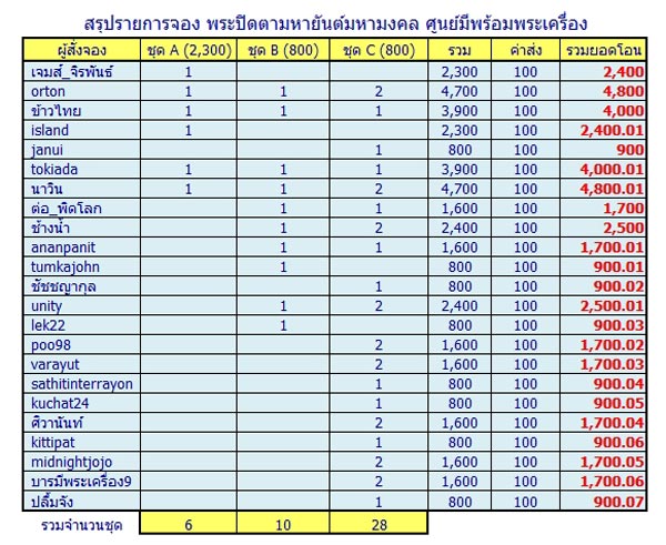 ยอดจากพี่ผู้จัดการ(ขอโทษที่เอ่ยนาม)ขายยกยอดทั้งหมด 12องค์รวมราคาจัดส่ง 5000บาท โดยจัดส่งจากพี่ผู้จัดการ(ขอโทษที่เอ่ยนาม)ถึงท่านโดยตรง พร้อมจะเมล์ไปขอให้พี่ผู้จัดการ(ขอโทษที่เอ่ยนาม)เปลี่ยนที่อยู่ในการจัดส่ง
