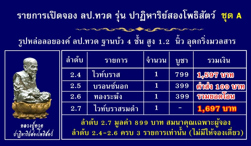 รูปหล่อลอยองค์ ลป.ทวด ฐานบัว 4 ชั้น สูง 1.2 นิ้ว อุดกริ่งมวลสาร โดยเปิดจองเป็นชุด 3 รายการ + รายการสมนาคุณ 1 รายการ