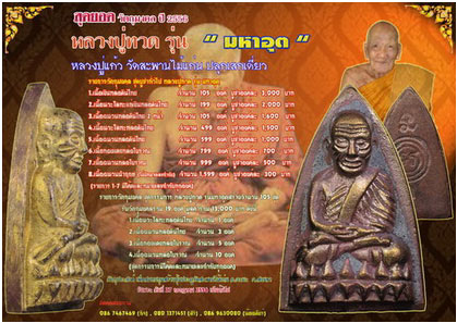 สุดยอดวัตถุมงคล ปี ๒๕๕๖ พุทธศิลป์สวยงามพุทธคุณสุดยอดเข้มขลัง หลวงปู่ทวด รุ่น มหาอุต หลวงปู่แก้ว วัดสะพานไม้แก่น อ.จะนะ จ.สงขลา วัตถุประสงค์ เพื่อสมทบทุนสร้างซุ้มประตูวัดสะพานไม้แก่น ชุดกรรมการ สร้างจำนวน ๑๐๕ ชุด จองชุดละ ๔,๐๐๐ บาท รับพระจำนวน ๑๙ องค์ มูลค่ารวม ๑,๓๐๐๐ บาท สนใจโทรด่วน 0867467469 (กิจ) รับพระวันที่ ๒๗ กรกฎาคม ๒๕๕๖ เป็นต้นไป ณ สถานที่สั่งจอง รายละเอียดการสร้างตามใบจองเลยครับ |