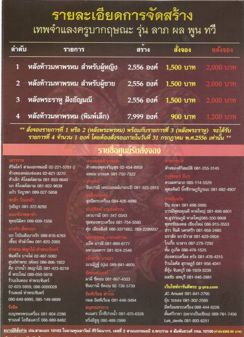 1. หลังท้าวมหาพรหม สำหรับผู้หญิง สร้าง 2556 องค์ จอง 1500 บาท หลังจอง 2000