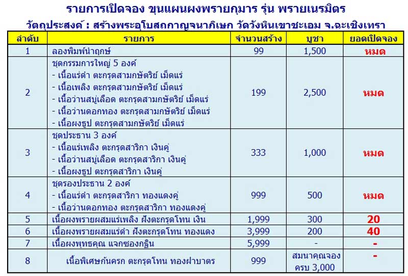 รายการที่ยังจองได้อยู่ มีเฉพาะรายการที่ 5 และ 6 ครับ นอกนั้นยอดจองเต็มหมดแล้วจริงๆ แต่เนื้อล่างๆก็ไม่ควรมองข้ามนะครับ พระขุนแผนที่ ลพ.สาคร ปลุกเสก ดีทุกรุ่นครับ