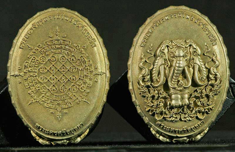 4. เหรียญหล่อรูปไข่หลวงปู่ทวดขอบบัวรอบ (ประกอบ 4-6 ชิ้น) หลังช้างเอราวัณ อุดมวลสาร สูง 3.5 ซม.