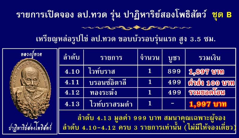 ชุด B จะเป็นเหรียญหล่อรูปไข่ ลป.ทวด บัวรอบรุ่นแรก ขนาดสูง 3.5 ซม. โดยเปิดจองเป็น set 3 รายการ + รายการสมนาคุณ 1 รายการ