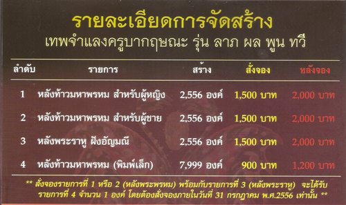 1. หลังท้าวมหาพรหม สำหรับผู้หญิง สร้าง 2556 องค์ จอง 1500 บาท หลังจอง 2000