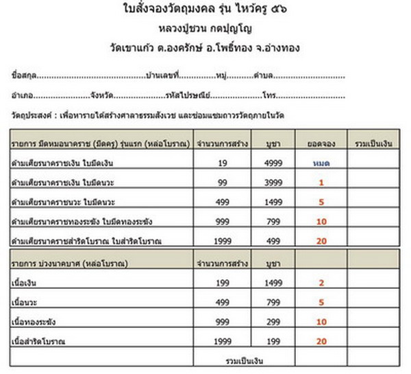 เปิดจอง ราคาวัด!! วัตถุมงคล รุ่นไหว้ครู๕๖ หลวงปู่ชวน วัดเขาแก้ว จ.อ่างทอง (มีดนาคราช-บ่วงนาคบาศ )